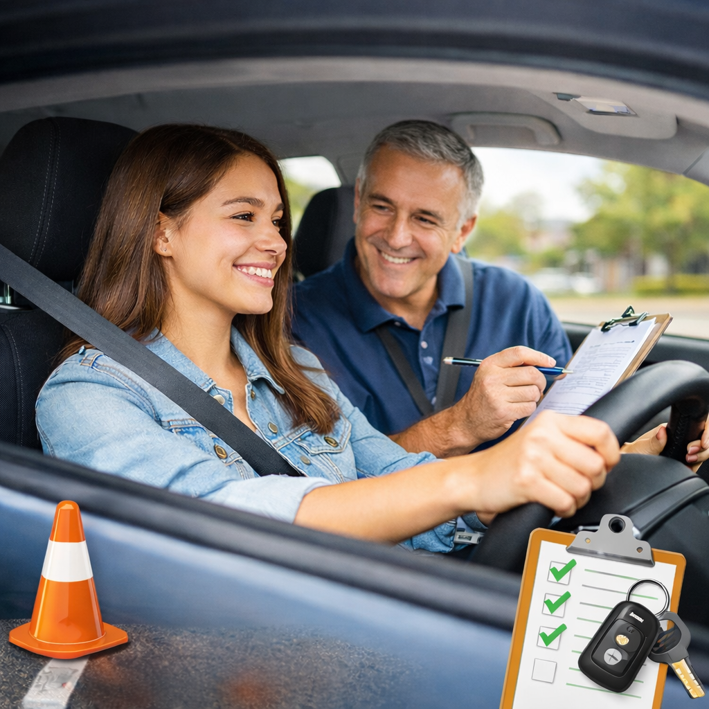 You learn from the start and build skills step by step. You practice steering control, turns, intersections, lane changes, merging, parking, and driving in traffic until you drive on your own with confidence.